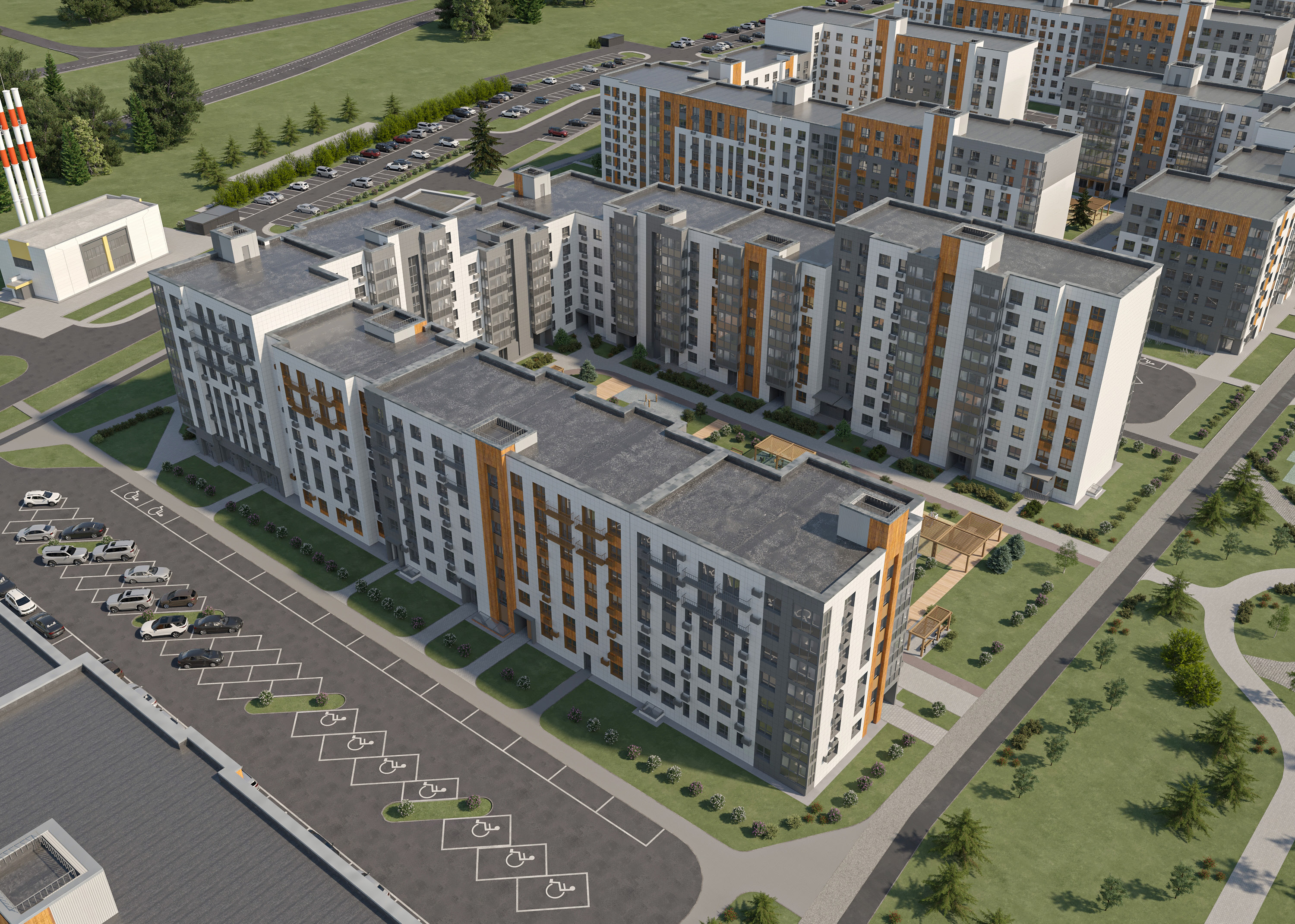 Сами дворы-парки закрыты для машин, оснащены видеонаблюдением и детскими комплексами из натурального дерева. Для владельцев авто предусмотрены станции зарядки электрокаров, а для прогулок доступен соседний лесопарк с озером и специально оборудованной площадкой для приготовления еды на огне, что позволяет сохранить загородный стиль жизни с семейными пикниками и встречами с соседями, не выезжая за пределы микрорайона.
