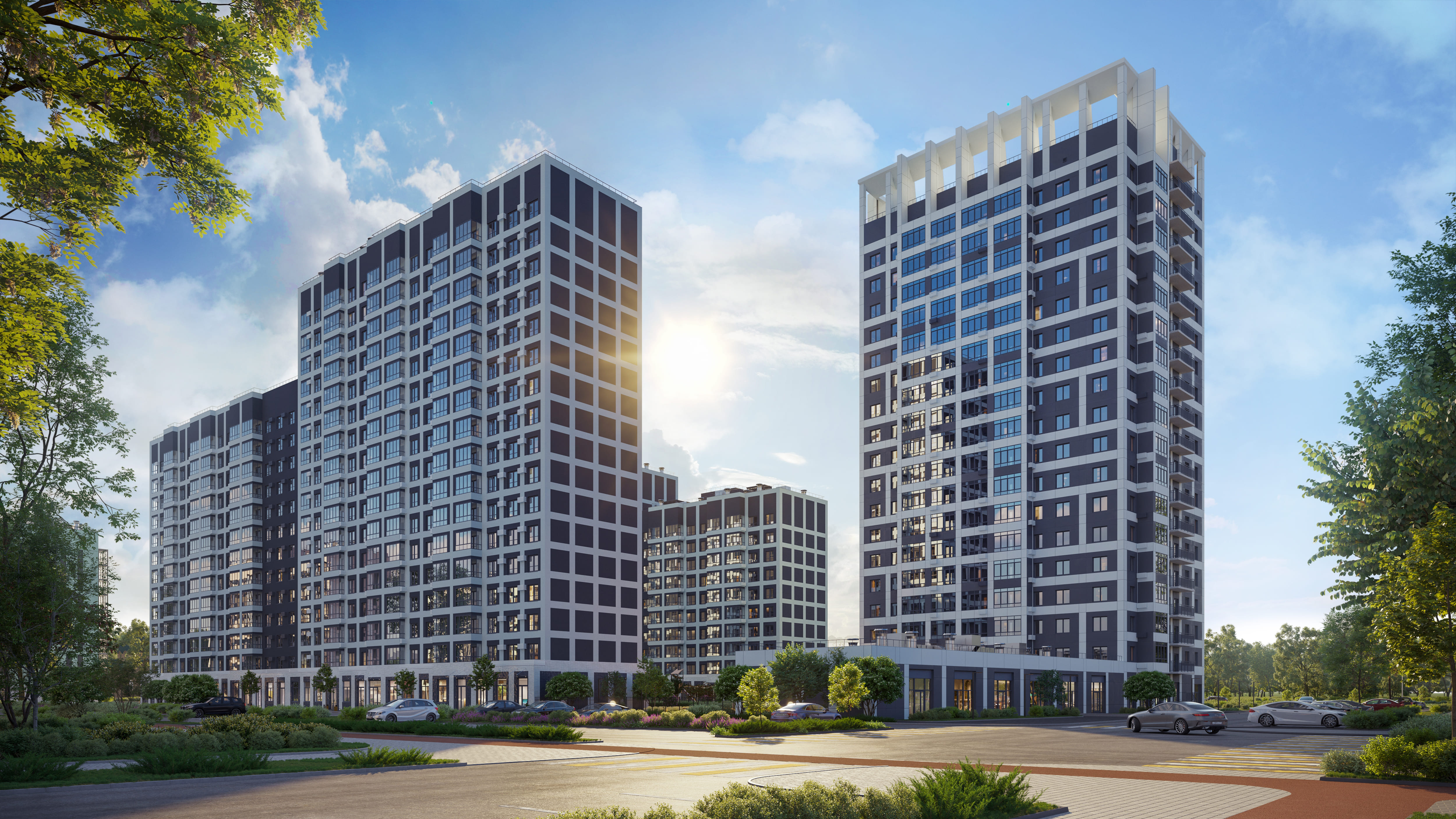 Дизайнерские входные группы спроектированы как вестибюли с лаунж-зонами и колясочными на каждом этаже, а парковочная стратегия включает наземные стоянки и строительство многоуровневого паркинга на 499 машиномест.