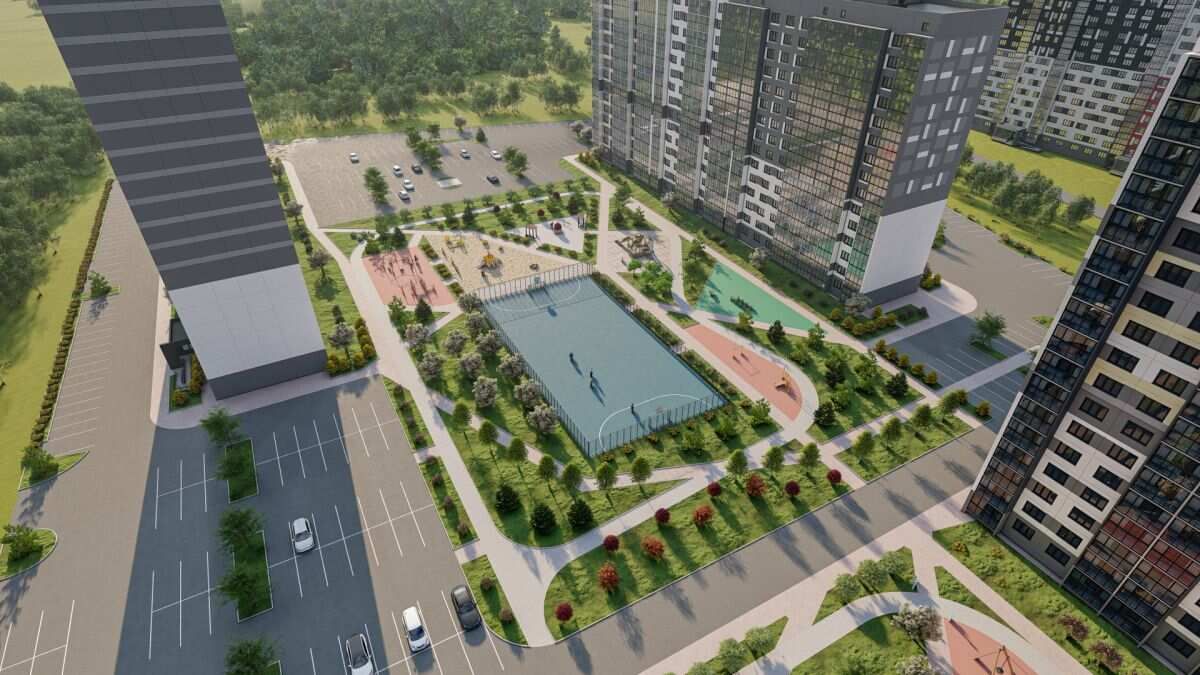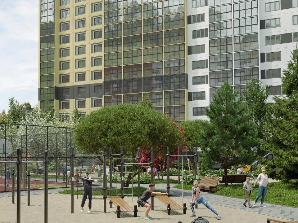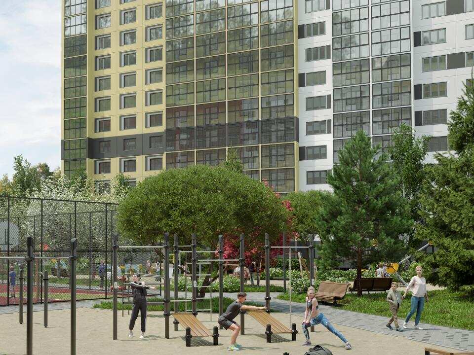 Благоустройство охватывает 20 000 кв. м озеленения и 6 000 кв. м площадок для спорта и отдыха, примыкающих к березовой роще. В микрорайоне реализована концепция «двор без машин» с входными группами внутри закрытого периметра.