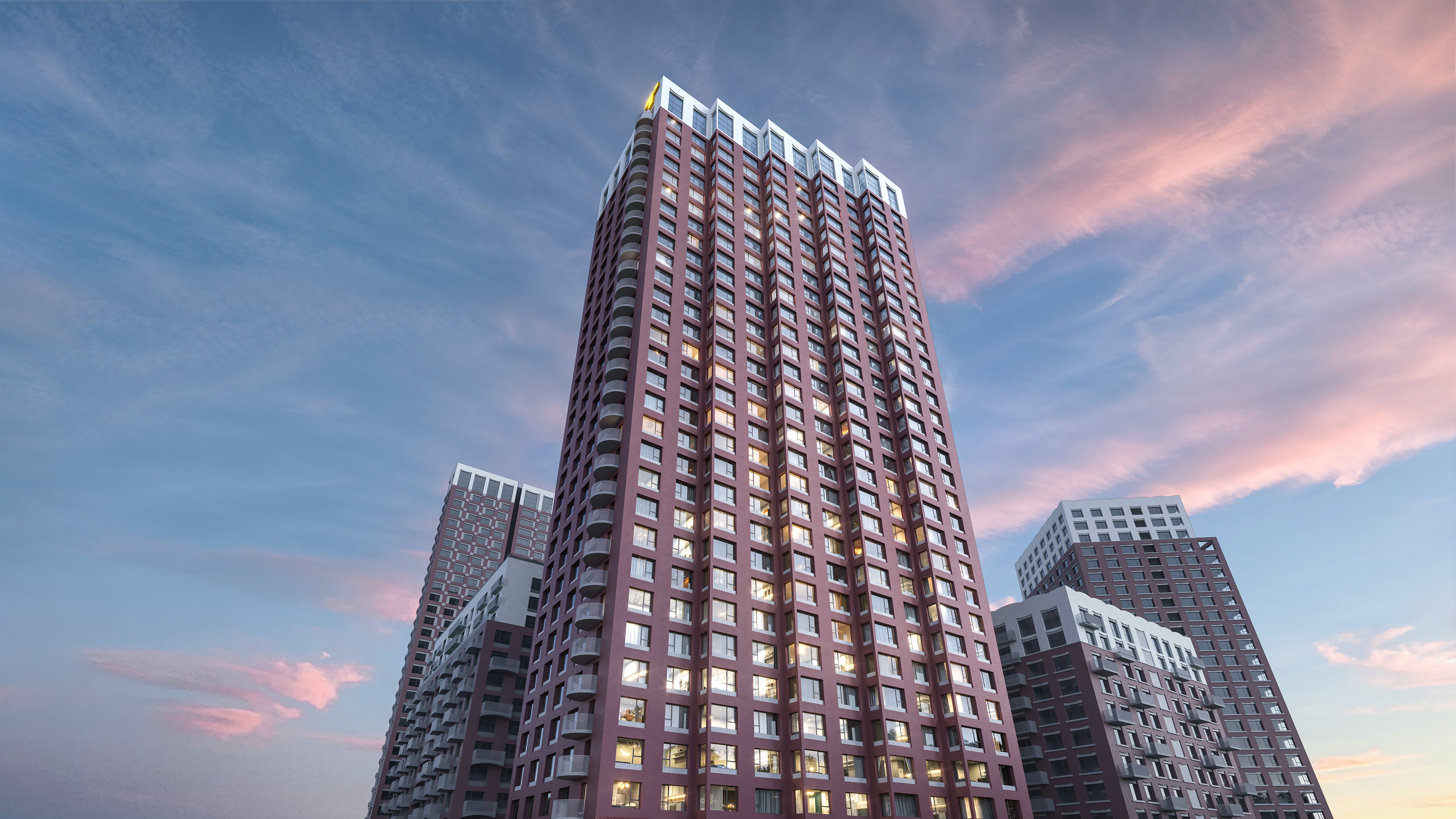Квартирография включает редкие форматы: мастер-спальни с личными ванными, панорамные окна в пол и потолки до 4 метров на крайних этажах. Уникальное решение — квартиры первого этажа с приватными террасами в формате городских таунхаусов.
