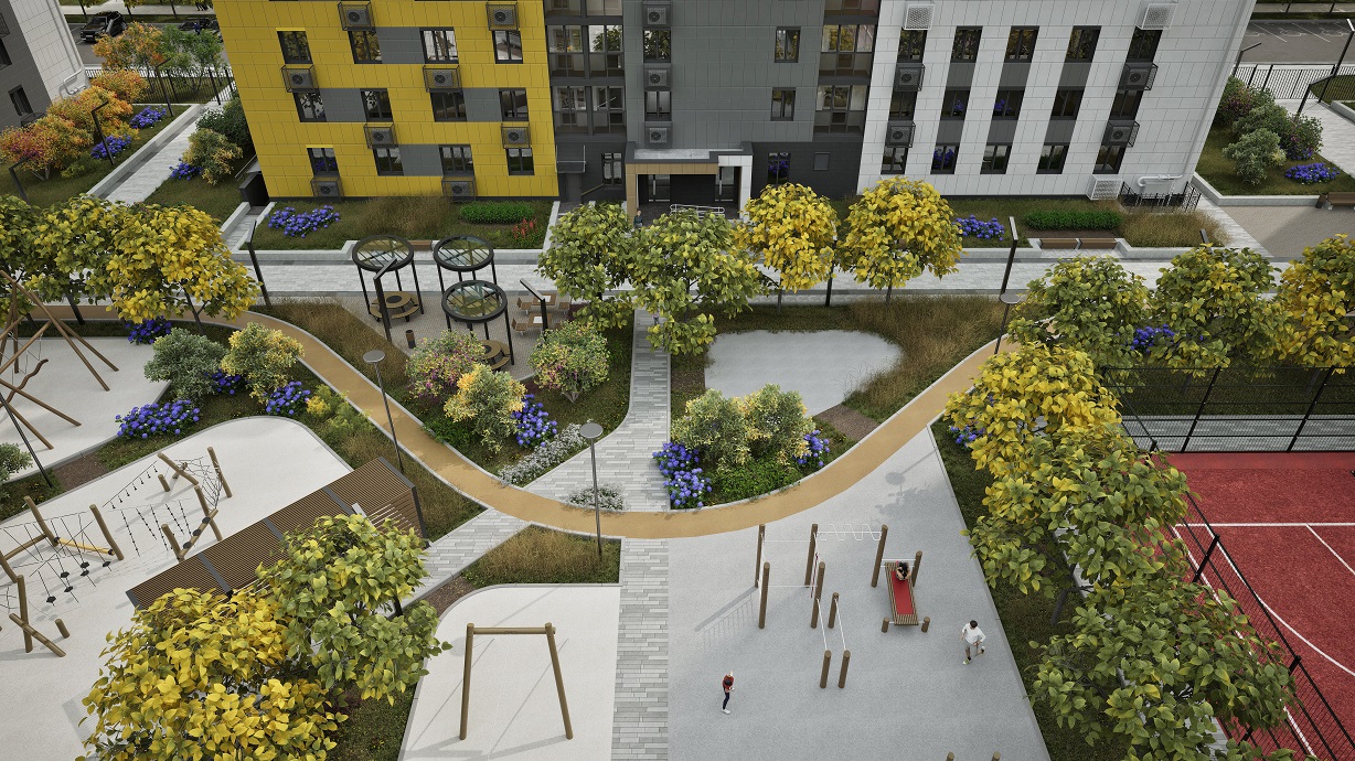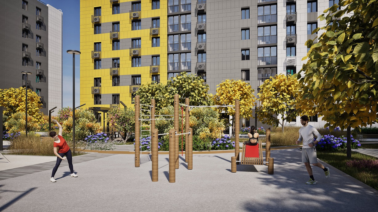 Социальная среда уже сформирована: в шаговой доступности находятся три школы и детский сад. Внутри квартала спроектированы ландшафтный дизайн, детские и воркаут-площадки.